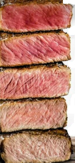 En el mundo de las carnes encontramos muchos “Puntos de cocción” que, por definición sería “el grado de cocción que ha alcanzado en un alimento, y que está determinado por su color, textura y jugosidad”… El punto de cocción de la carne, al que también se le define como el “grado de cocción”, está asociado al tiempo y temperatura en que se puede someter a la carne, afectando ambos parámetros al cómo reaccionan las proteínas en el interior de la misma. Estos puntos, comunes por cierto, van desde «rojo» que es cuando la carne está bien jugosa (poco hecha), sangrante; hasta «bien cocido», o “muy hecho» y es cuando la carne totalmente cocida y perdiendo, prácticamente todos sus jugos, sin ningún rastros de color rosado en su interior.