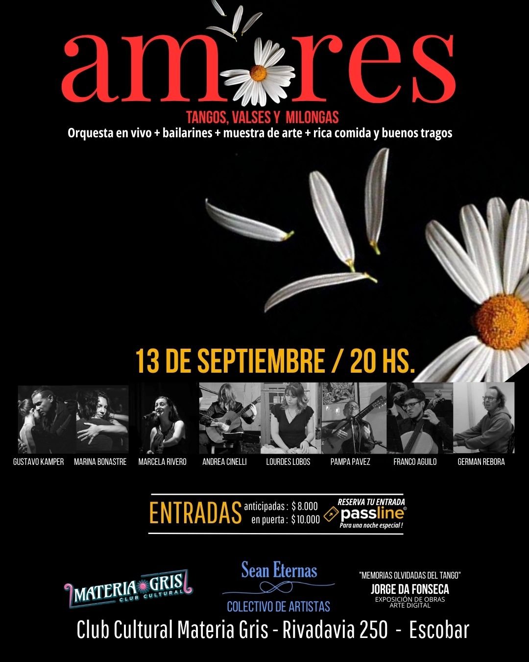 Su voz es parte fundamental del espectáculo Amores, una propuesta para los amantes del tango, con orquesta en vivo, bailarines, arte y excelente gastronomía y tragos que se presentará el sábado 13 de septiembre a las 20 horas en el Club Cultural Materia Gris, Rivadavia 250, de Belén de Escobar. Con Marcela Rivero en la voz; Andrea Cinelli y Pampa Pavez, en guitarras; Lourdes Lobos, percución; Germán Rébora, piano; Franco Aguiló, violoncellista y los bailarines Gustavo Kamper y Marina Bonastre.