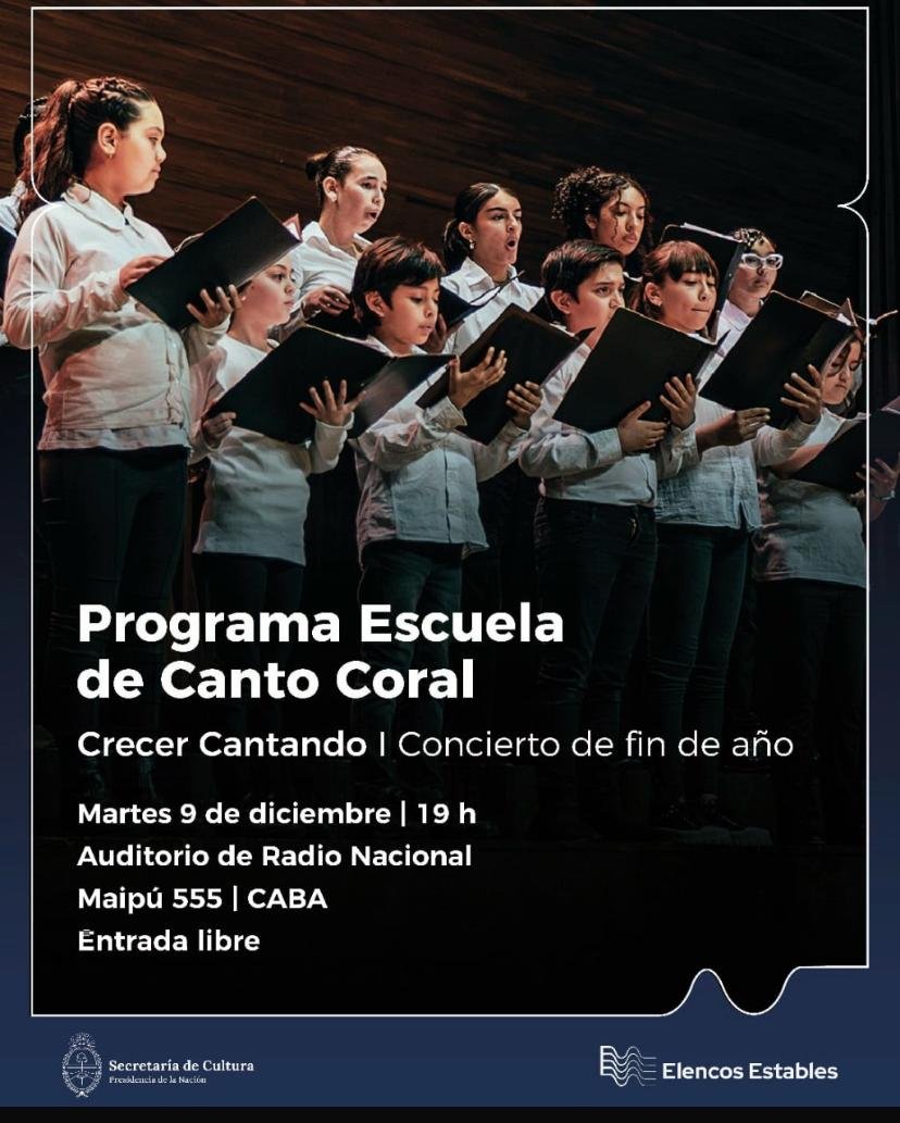 El próximo martes 9 de diciembre a las 19h se llevará a cabo el último concierto del año del “Programa Escuela de Canto Coral” de la Dirección Nacional de Elencos Estables de la Secretaría de Cultura de la Nación.