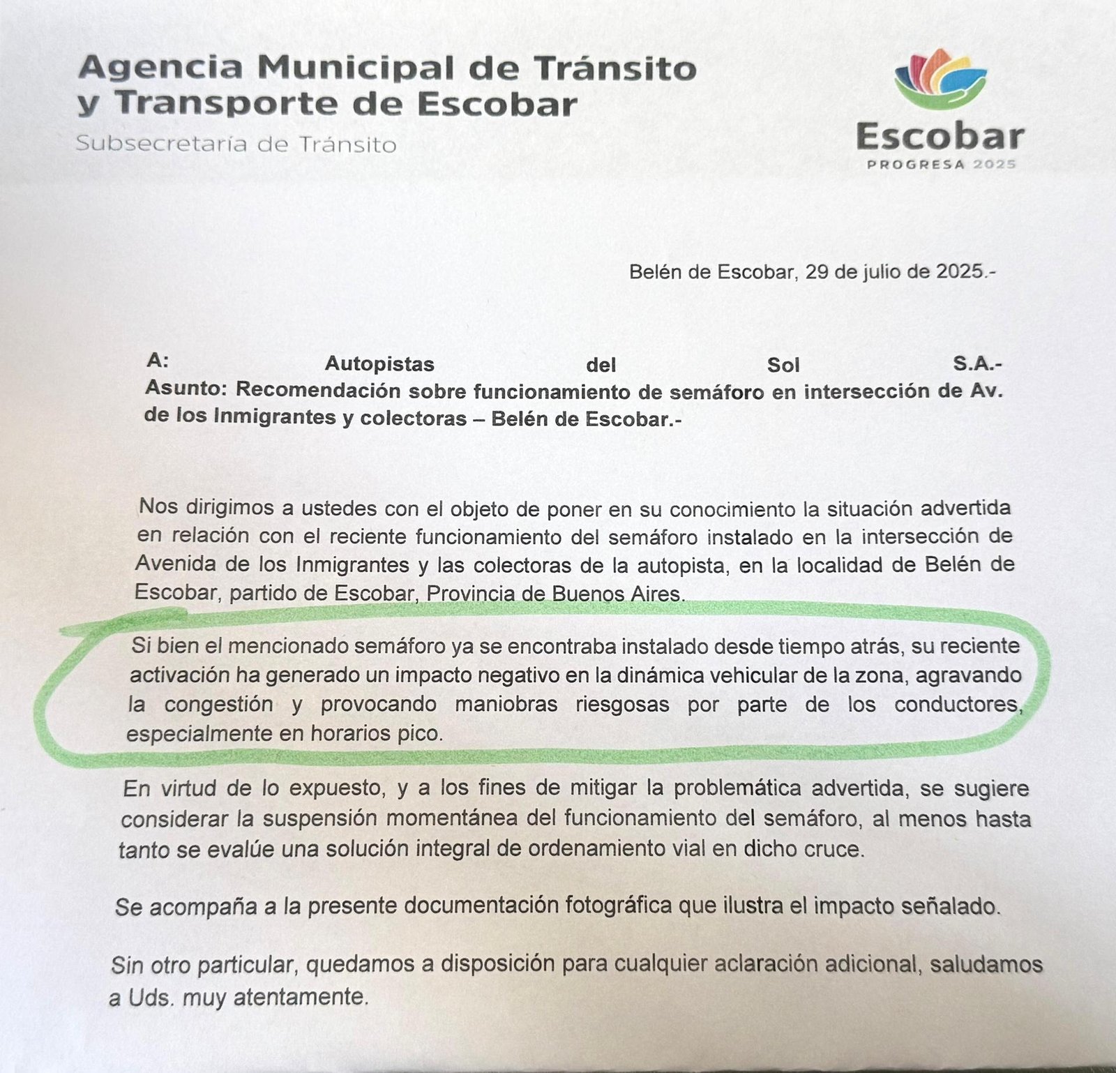 La Municipalidad de Escobar, a través de la Agencia Municipal de Tránsito y Transporte, elevó un reclamo formal ante Autopistas del Sol (AUSOL) por los severos inconvenientes de circulación en avenida De los Inmigrantes y ambas colectoras de Panamericana que genera el nuevo semáforo instalado por la empresa.