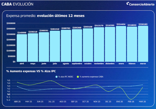 Según el informe la expensa promedio en CABA fue de $326.183 y registró una suba del 2,4% respecto al promedio de febrero que fue de $318.650. El incremento interanual llegó al 36%. En la Provincia de Buenos Aires, registraron un aumento interanual del 44,3%, con un valor promedio de $160.921 en marzo, lo que representó una suba del 3,5% respecto de febrero.