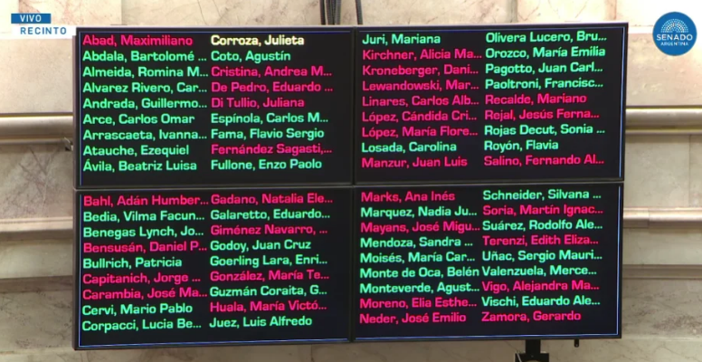 La iniciativa obtuvo 40 adhesiones y 31 rechazos, tanto en la votación en general como en particular. Se abstuvo la neuquina Julieta Corroza. Los legisladores del interbloque kirchnerista Lucía Corpacci y Sergio Uñac acompañaron a libertarios y dialoguistas.