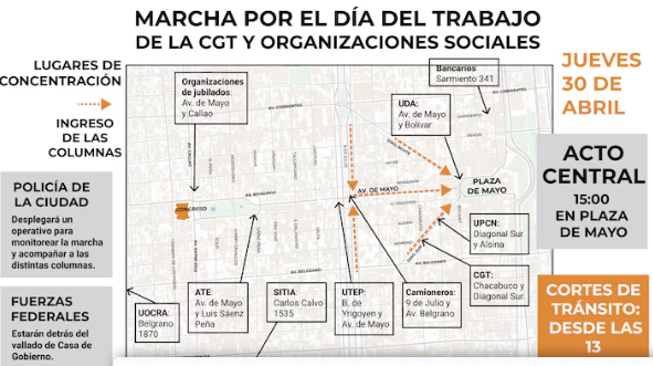 Las dos CTA y partidos y organizaciones de izquierda anticiparon que no coincidirán en el mismo acto para conmemorar el Día del Trabajador. Los puntos de concentración de movimientos sociales enrolados en la Unión Trabajadores de la Economía Popular (UTEP); la Asociación de Trabajadores del Estado (ATE); Bancarios; el Sindicato de Trabajadores de la Industria de la Alimentación (SITIA); organizaciones de jubilados; el gremio de Camioneros; UOCRA; UDA y buena parte de los gremios que conforman la CGT si utilizarn los puntos marcados como acto central.
