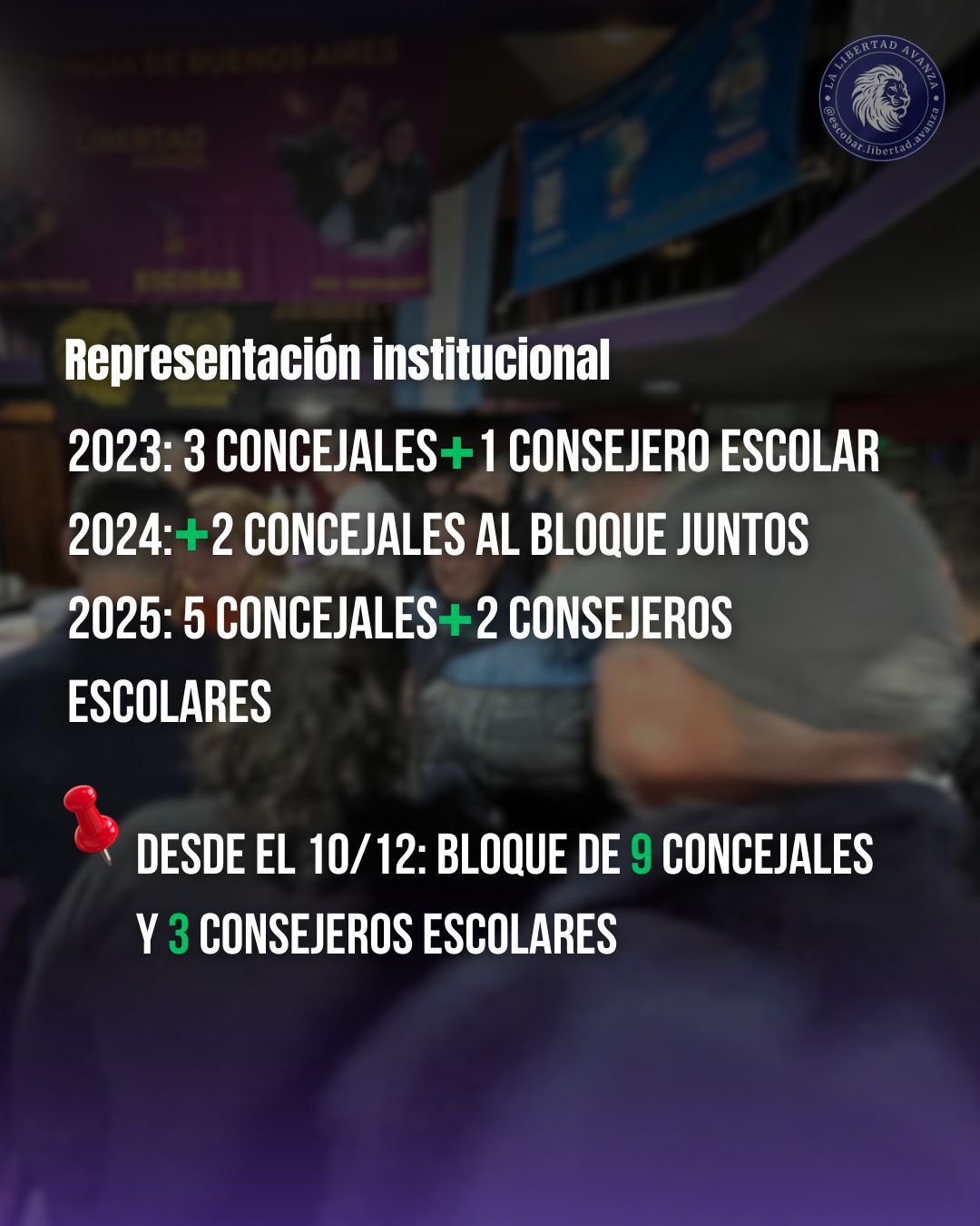 «Hoy (por el domingo 7)Escobar vivió una jornada histórica. Crecimos de 26 a 35 puntos, sumamos 5 concejales y 2 consejeros escolares, y consolidamos un bloque más fuerte para defender a los vecinos»… “miles de vecinos se animaron a levantar la voz. Vimos a comerciantes que, aun con temor, nos abrieron sus puertas. Vimos a familias que dijeron basta a los políticos que prometen y desaparecen. Esa fuerza, esa esperanza, esa bronca transformada en coraje, es la que hoy nos hizo lograr lo imposible: instalar un proyecto distinto, romper el silencio y demostrar que Escobar ya no piensa como antes”.