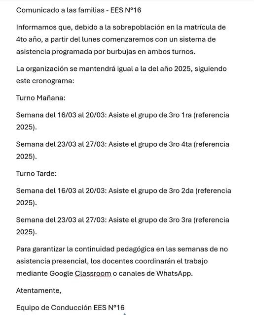 El Estado provincial debe garantizar la continuidad pedagogica de los alumnos y que estén matriculados en algun colegio. Por ello, creemos que sería una solución que se habilite el 4 año de turno vespertino en la escuela N°16 para garantizar a las familias al menos que sus hijos puedan seguir en el mismo establecimiento y cursar la misma cantidad de horas que cualquier otro alumno.