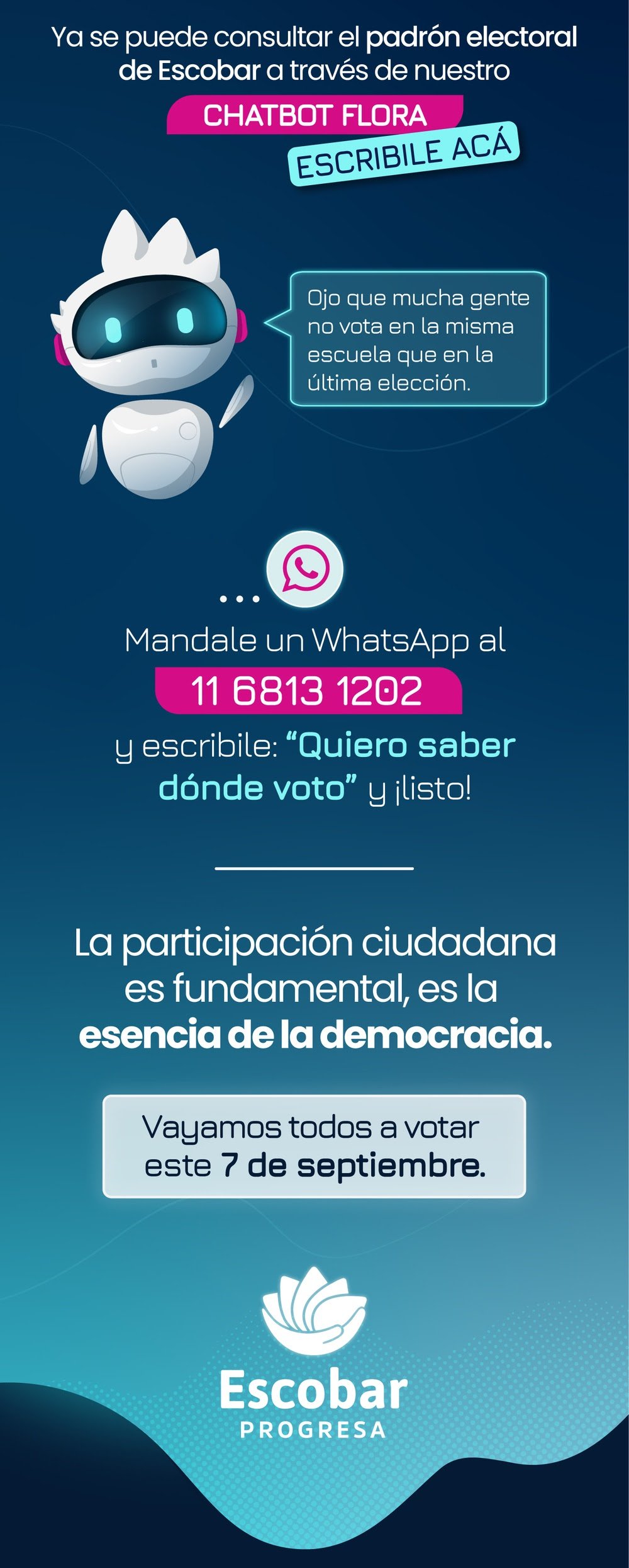 Los vecinos y vecinas del partido de Escobar ya pueden consultar dónde votar el próximo 7 de septiembre. Para eso, el Municipio habilitó la posibilidad de consultar a través de un simple mensaje de WhatsApp al chatbot Flora.