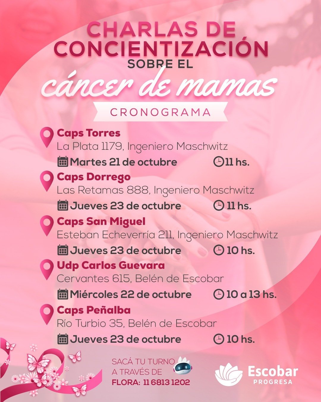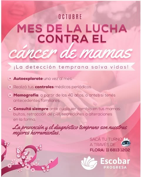 Además, se realizará una campaña de controles mamarios para afiliadas de PAMI e IOMA, sin turno previo, del lunes 27 al viernes 31 de octubre en el Hospital del Bicentenario (Almirante Brown y Libertad, Garín) – de lunes a viernes, de 9 a 10:30 hs; y en los Consultorios Externos Dra. Elena Rojas (Bv. Pte. Perón 1079, Garín) – martes y jueves, de 14 a 15 hs.«Cuidar la salud es prevenir. Seguimos realizando actividades de prevención y concientización durante todo octubre. Consultá nuestro feed para conocer el cronograma completo – dijeron desde el área.