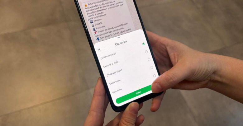Al iniciar la conversación, Flora desplegará un menú con la leyenda “¿Te cuento más sobre el CUD?” y las opciones “¿Cómo sacarlo?”, “Extravié el CUD”, “¿Para qué sirve?” y “Sacar turno”.