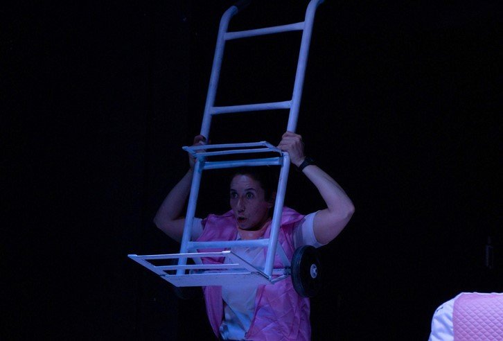 La escenografía, despojada, deja espacio al cuerpo, los silencios y los desplazamientos. Una butaca y un carro zorra —mínimos signos del mundo camionero— acompañan las distintas derivas narrativas. La protagonista viste de rosa, en contradicción con su ropa de trabajo: rígida como su