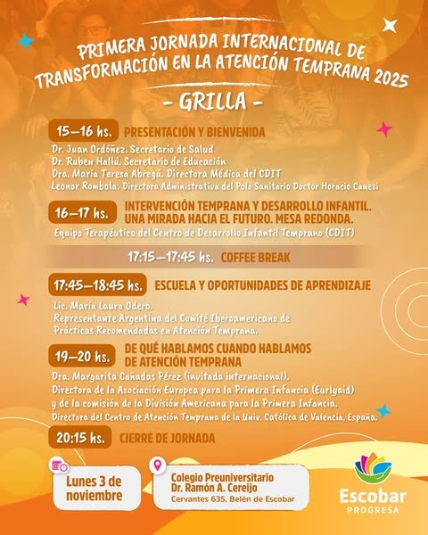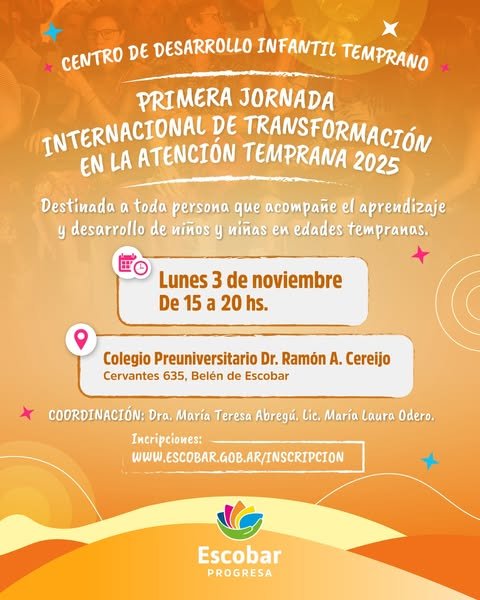La Primera Jornada Internacional de Transformación en la Atención Temprana 2025, organizada por el Centro de Desarrollo Infantil Temprano, se realizará el lunes 3 de noviembre de 15 a 20 horas en el Colegio Preuniversitario Dr. Ramón A. Cereijo (Cervantes 635, Belén de Escobar).